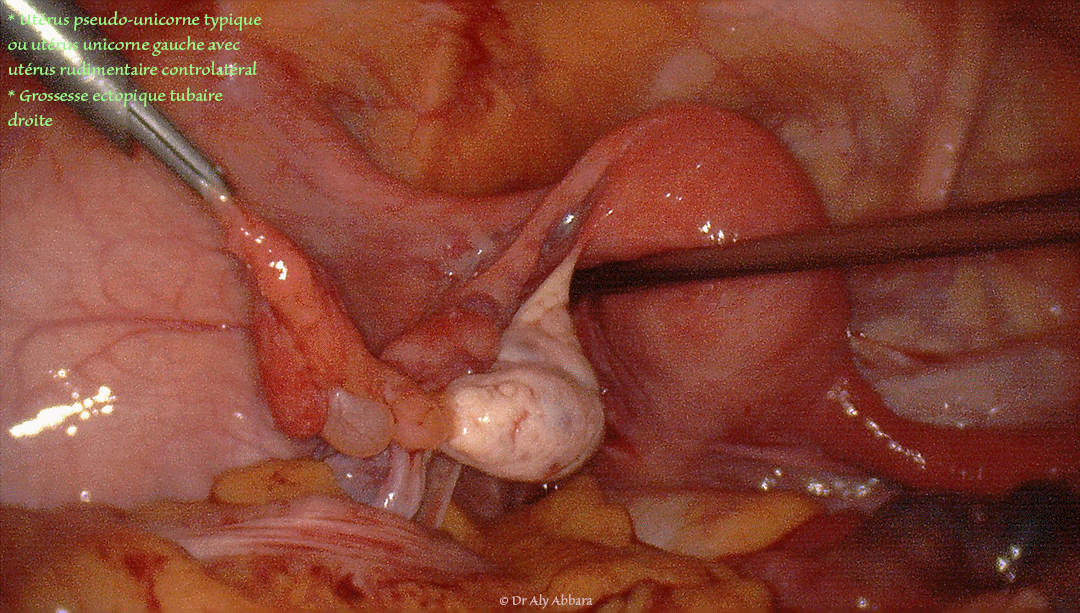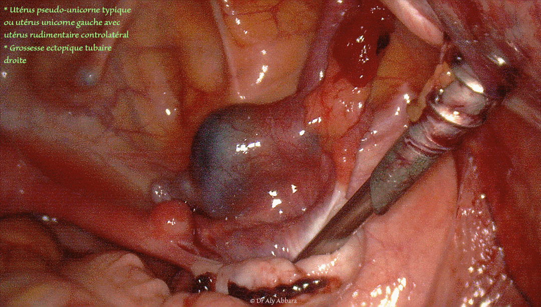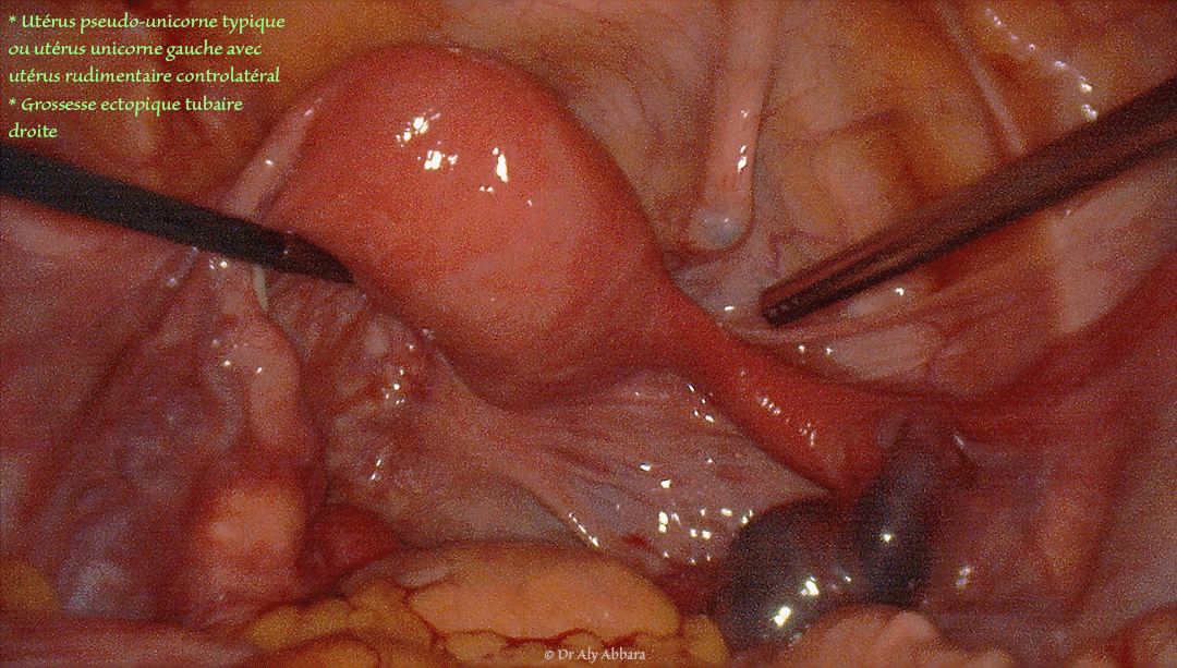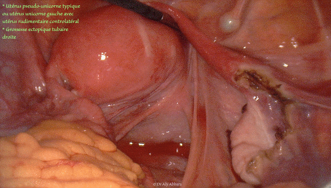 - Images cliniques cœlioscopiques montrant un utérus malformé, pseudo unicorne typique gauche avec corne droite rudimentaire et grossesse extra-utérine tubaire droite (hématosalpinx).