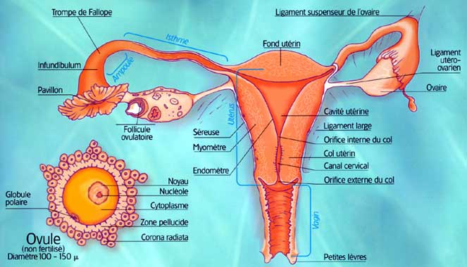 Illustration schématique montrant l'ensemble des organes génitaux internes (OGI) : le vagin ; l'utérus avec son col utérin traversé par le canal endocervical qui relie la cavité vaginale à la cavité du corps de l'utérus ; le corps de l'utérus avec ses parois musculaires composées du (myomètre ou le muscle de l'utérus) et enfin, au sein de l'utérus ou retrouve sa cavité tapissée par l'endomètre.