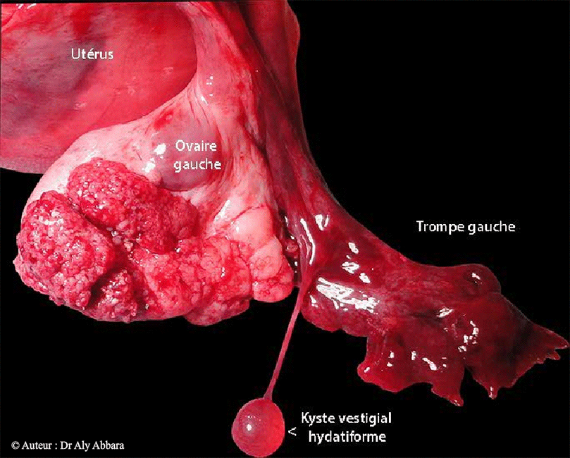 | Images montrant l'aspect macroscopique d'un adénome fibreux séreux exophytique bénin de l'ovaire gauche, découvert fortuitement lors d'une hystérectomie par laparotomie, chez une femme âgée de 48 ans, nulligeste, souffrant de ménorragies sévères, et anémie à répétition dans un contexte d'un utérus polymyomateux de 15 cm de hauteur. L'examen anatomopathologique de cette tumeur exophytique et bourgeonnante sur la surface de l'ovaire gauche, montre qu'il s'agit d'une masse mesurant (5 x 3,5 x 2 cm de diamètre), composée de structures papillaires présentant un axe fibreux, quelques calcifications sont visibles ; il n'existe pas de zone d'infiltration carcinomateuse, ni stratification épithéliale, ni d'anomalies nucléaires. Pas d'implants péritonéaux, ni d'ascite. On remarque sur cette image la présence d'une petite formation vésiculaire attachée à la portion moyenne de la trompe gauche par un long filament séreux vasculaire ; il s'agit d'un élément anatomique vestigial connu sous d'appendice vésiculeuxanciennement l'hydatide pédiculée de Morgani |