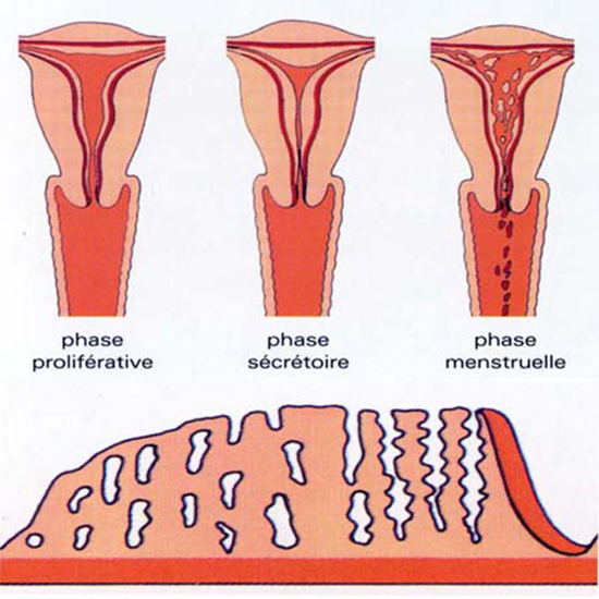 Les trois phases du développement de l'endomètre au cours d'un cycle menstruel normal :