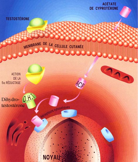 Avec ce mécanisme d'action, l'acetate de cyprotérone bloque le déclenchement des actions androgéniques du seul androgène actif au niveau des cellulue cibles, c'est-à-dire la (DHT).