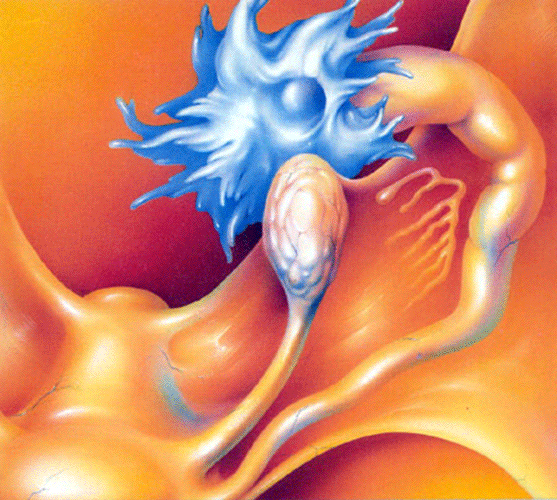 La trompe utérine de Fallope (gauche) avec ses trois portions apparentes : la portion proximale apparente (ou l'isthme tubaire), puis l'ampoule tubaire et enfin, à l'extrémité distale de la trompe on retrouve l’infundibulum (ou le pavillon tubaire) en forme d’entonnoir muni de franges entourant l'ostium tubaire externe qui s'ouvre à la cavité pelvienne.