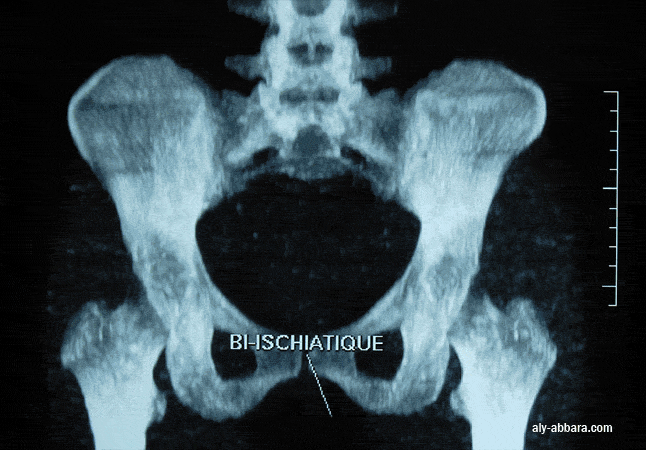 La scanopelvimétrie (scannopelvimétrie) Bassin féminin vu de face : mesure du diamètre bi-ischiatique : la distance mesurée entre les faces internes des deux tubérosités ischiatiques ; en moyenne 110 mm. |