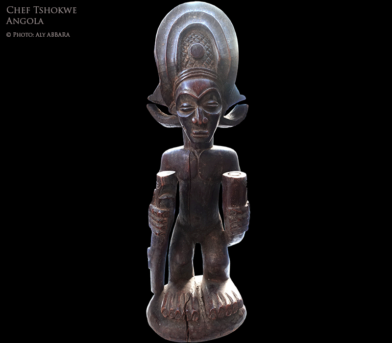 Cette statue en bois représente un chef Tshokwe debout, nu et trapu (de bonne corpulence musculaire).