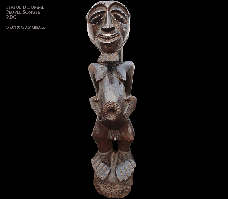 Les deux volumineux mains soutiennent latéralement le ventre. Le volume important des pieds est des mains est une caractéristique des statues Tshokwe.