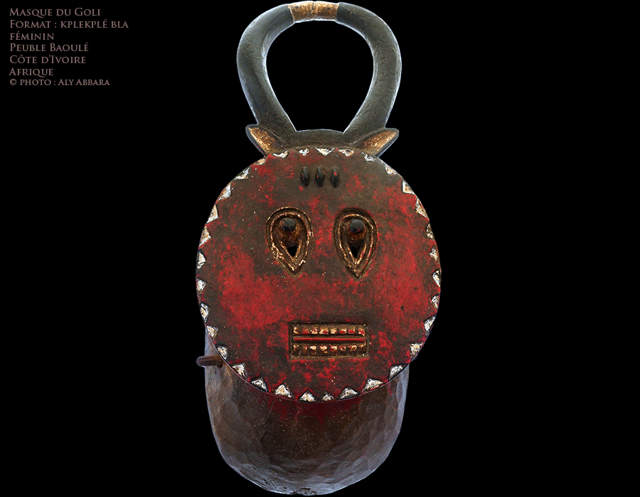 • Les masques goli : ils sont de plusieurs types. Le type " kple kple " est de forme ronde surmontée de deux cornes. Les Baoulé ont emprunté ce type de masque de leurs voisins les Wan. Ils sont utilisés lors d'une fête célébrant la paix et la joie, la nouvelle récolte, la visite d'un haut dignitaire et les funérailles d'un notable important. Les porteurs de ces masques représentent les jeunes et adolescents hommes.