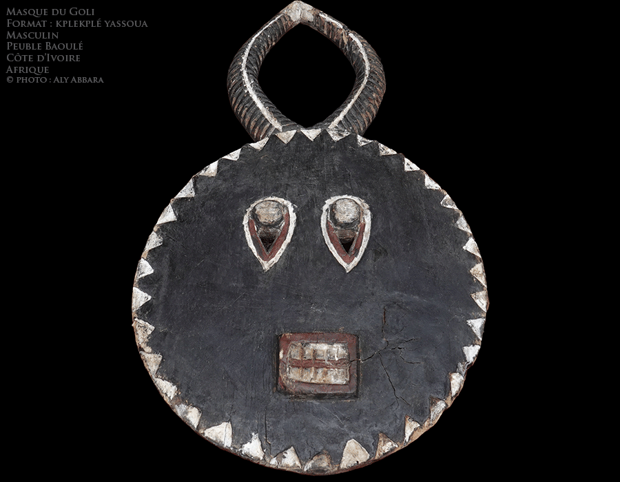 - Les masques goli : ils sont de plusieurs types. Le type " kple kple " est de forme ronde surmontée de deux cornes. Les Baoulé ont emprunté ce type de masque de leurs voisins les Wan. Ils sont utilisés lors d'une fête célébrant la paix et la joie, la nouvelle récolte, la visite d'un haut dignitaire et les funérailles d'un notable important. Les porteurs de ces masques représentent les jeunes et adolescents hommes.