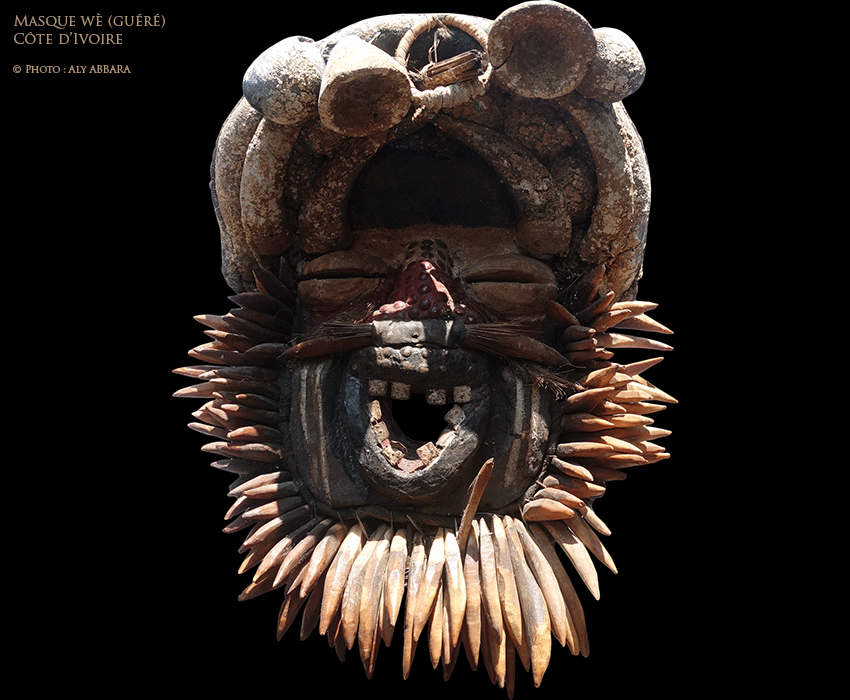 - Leurs masques d'épouvante provoquent le rire et également la terreur et la menace de danger ; ils servent à rétablir les liens avec les ancêtres lors des fêtes et les danses.