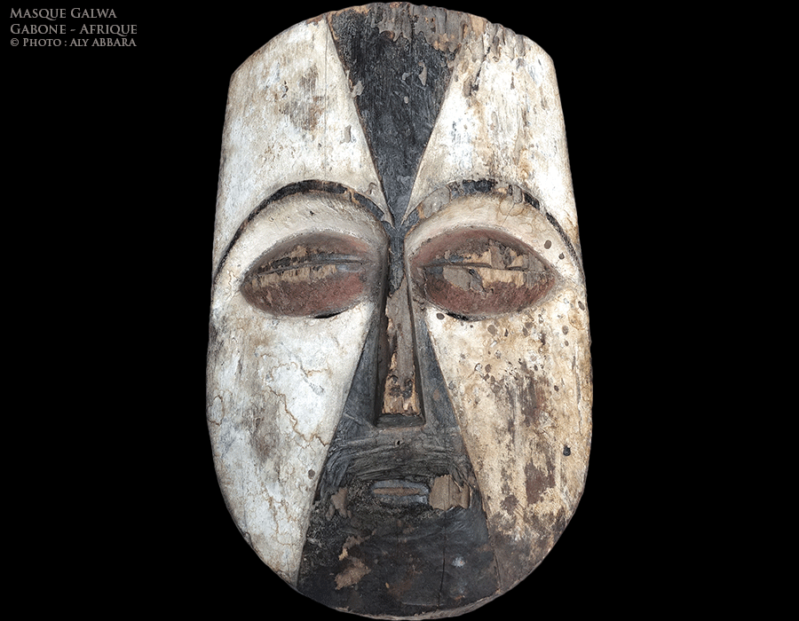 - Masque polychrome (blanc, noir et brun) ; le front est large et haut avec crâne tronqué ; les sourcils et les arcades des yeux sont en forme de deux longs arcs se rejoignant au niveau de la racine du nez (beaucoup de ressemblance avec les masques des voisins des Galwa, c'est-à-dire, les Tsogho).