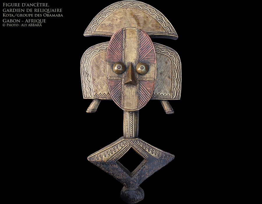 - Dans la majorité des statues de reliquaire le corps qui se trouve en dessous du cou se divise en deux branches qui se rejoignent plus bas après avoir limité un losange se trouvant dans le même plan du visage ; ces deux branches servent comme poignée ou bras facilitant le déplacement de l'ensemble statue-reliquaire.