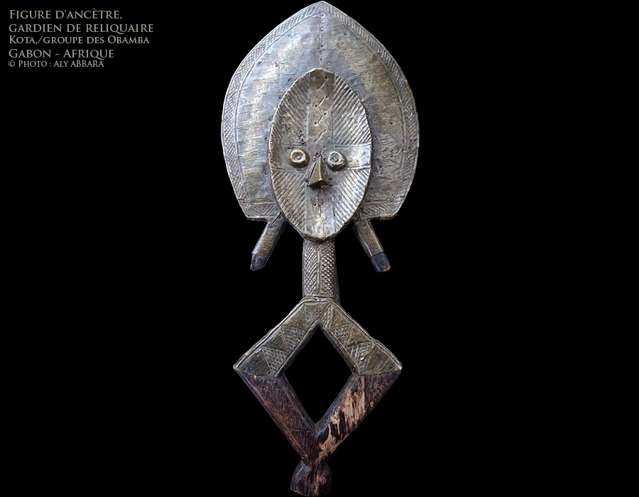 - Dans la majorité des statues de reliquaire le corps qui se trouve en dessous du cou se divise en deux branches qui se rejoignent plus bas après avoir limité un losange se trouvant dans le même plan du visage ; ces deux branches servent comme poignée ou bras facilitant le déplacement de l'ensemble statue-reliquaire.