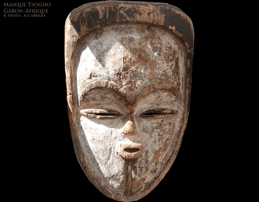 - Les Tsogho au nombre de 13 000 vers en 2008 ; ils sont installés sur les rives de la Ngounié, voisins des Kwele avec lesquels ils partagent autrefois l'activité de razzias et de pillages à l'intérieur des terres afin de fournier les esclaves à la traite des Noirs en Afrique. Les Tsogho, sous l'influence d leurs voisins les Punu et les Lumbu, ils ont adopté la teinte blanche pour colorier leurs masque. Le masque, durant la nuit est un objet pouvant susciter la crainte ; il est sacré et réservé aux initiés de la société bwiti, mais durant la journée peut apparaître à tous et devenir un objet de jeux. Chaque masque a son nom propre et son symbolisme exprimé par le chant et dans.