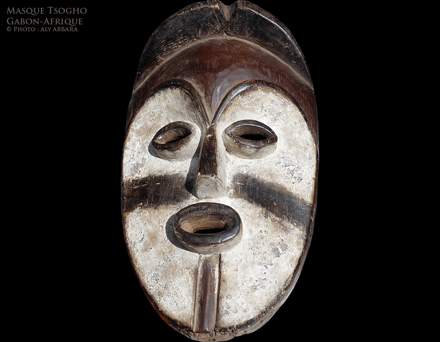 - Les Tsogho au nombre de 13 000 vers en 2008 ; ils sont installés sur les rives de la Ngounié, voisins des Kwele avec lesquels ils partagent autrefois l'activité de razzias et de pillages à l'intérieur des terres afin de fournier les esclaves à la traite des Noirs en Afrique. Les Tsogho, sous l'influence d leurs voisins les Punu et les Lumbu, ils ont adopté la teinte blanche pour colorier leurs masque. Le masque, durant la nuit est un objet pouvant susciter la crainte ; il est sacré et réservé aux initiés de la société bwiti, mais durant la journée peut apparaître à tous et devenir un objet de jeux. Chaque masque a son nom propre et son symbolisme exprimé par le chant et dans.