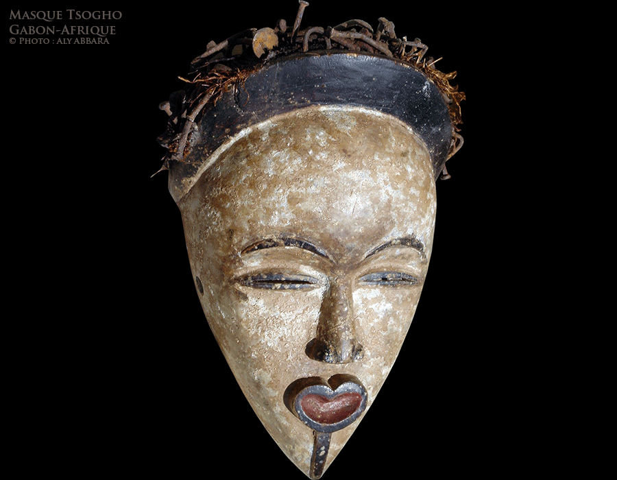 - Masque polychrome, blanc, ocre, bleu et noir ; le visage est de forme triangulaire au menton en pointe ; le front est haut et large ; les sourcils et les arcades des yeux sont en forme de deux longs arcs se rejoignant au niveau de la racine du nez ; les yeux sont très étirés en amande, il s'agit d'un critère de beauté chez les Tsogho ; la bouche est ouverte laissant apparaître la couleur ocre de la cavité buccale ; cette bouche semble poussant un cris.