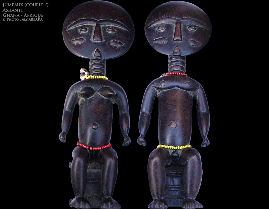 - Les têtes de ces figurines sont aplaties, discoïdes, rappelant les poupées "akuaba" ou les Poupées de fertilité Ashanti.