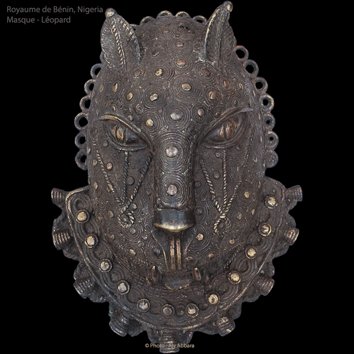 | Art africain " Tête - Masque de léopard " Objet artistique métallique décoratif Royaume de Bénin - Nigeria الفن الأفريقي ـ نموذج قبائل مملكة البينان في نيجيريا رأس حيوان مفترس (فهد) على شكل قناع للوجه |
