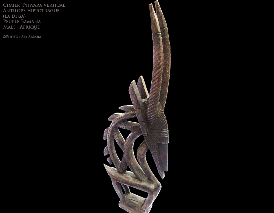 - L'animal représenté dans ce cimier est la dega (chez les Bamana), une antilope-cheval (hippotragus equinus) d'où la présence de deux longues cornes, puis chez les mâles de cette espèce, en arrière de la tête, une crinière fournie, volant au vent.