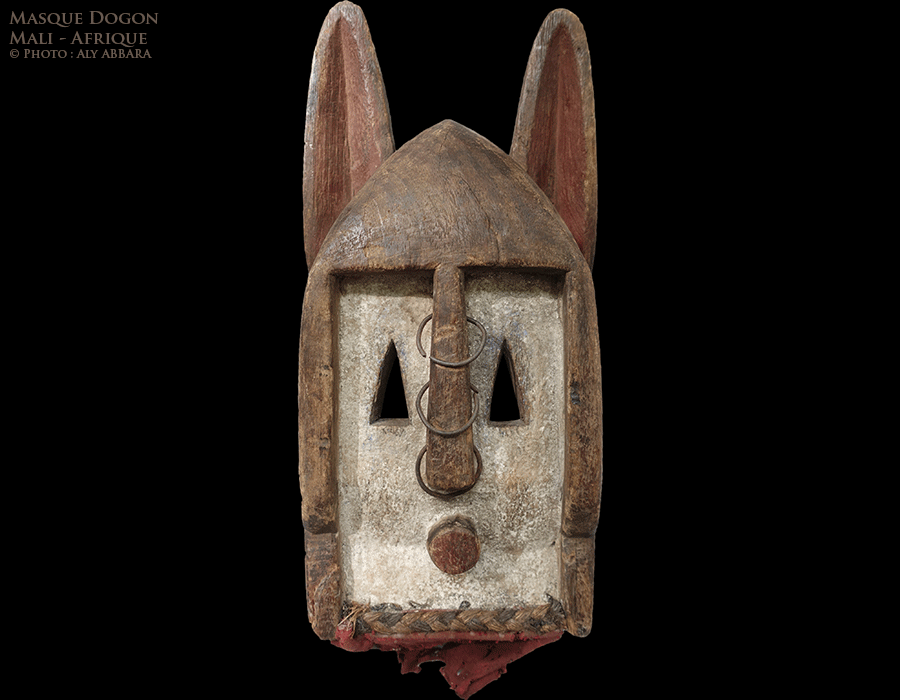 - En arrière-plan on retrouve deux grandes oreilles animalières (d'an ?) érigées verticalement ; elles indiquent la haute puissance de la capacité auditive du porteur du masque et de son attitude en extrême vigilance.