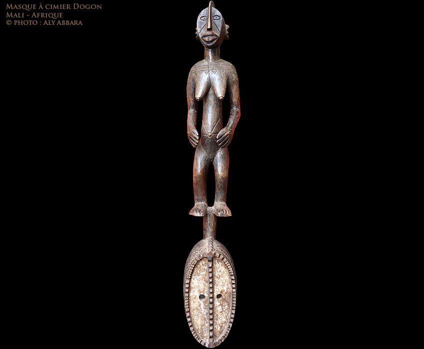 - Masque ovale et géométrique surmonté de statue de femme nue et debout.