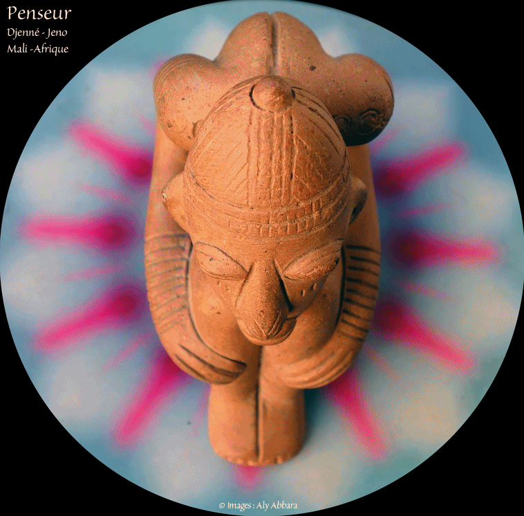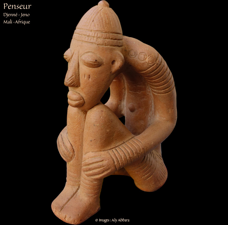 | Art africain - Djenné - Mali Le " Penseur " (homme en état de réflexion) Homme assis avec les deux genoux repliés et supportant la tête Céramique sculptée - Style Djenné Jeno الفن الأفريقي ـ نموذج منطفة جيه نيه ـ مالي الرجل المفكر رجل بوضعية الجلوس ؛ الركبتان المنعطفتان تسند الرأس |