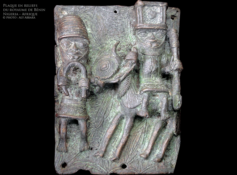 • Ces plaques métalliques, à l'origine, ornaient les colonnes de bois de la façade du palais royal de la Bénin-cité et les colonnes qui soutenaient sa toiture. Leur production aurait commencé au début du 16° siècle et elle a pris fin vers 1700.