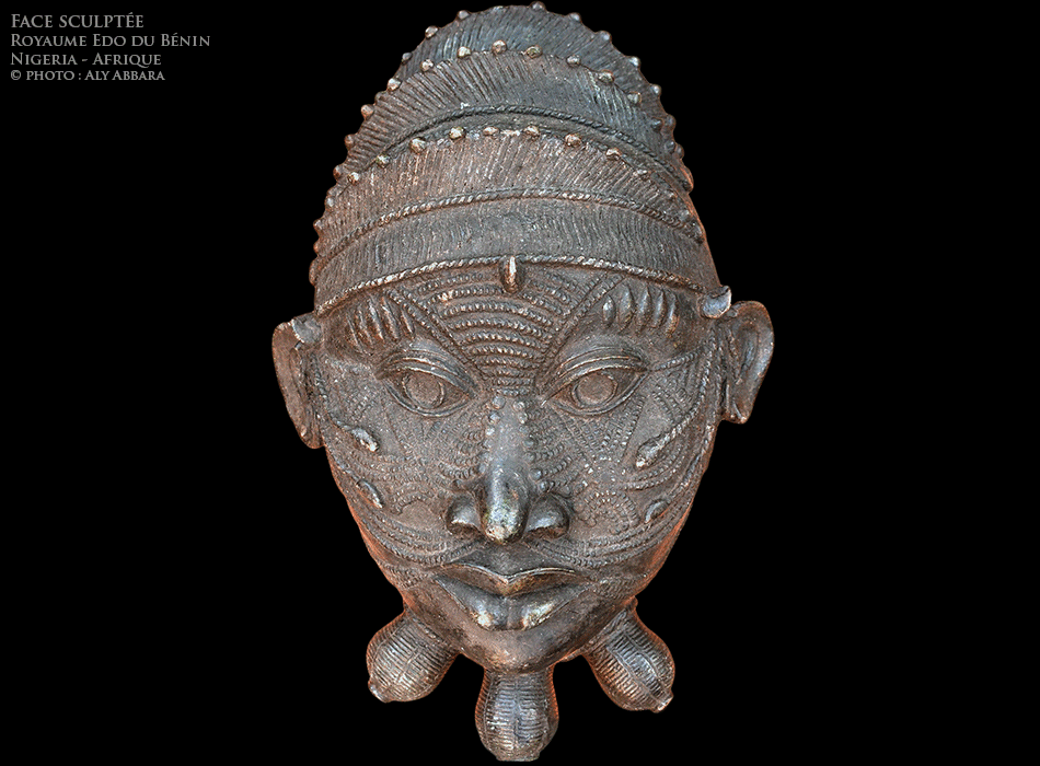 Art africain - Visage humain magnifié - Objet artistique métallique décoratif - Royaume de Bénin - Nigeria - Exemple 01