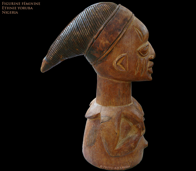 - Cette sculpture représente le buste d'une femme Yoruba (profil), elle se caractérise par la tête allongée et la coiffure en forme de longue corne. Le visage porte des scarifications lancéolées (en forme de fer de lance) sur le front les deux joues.