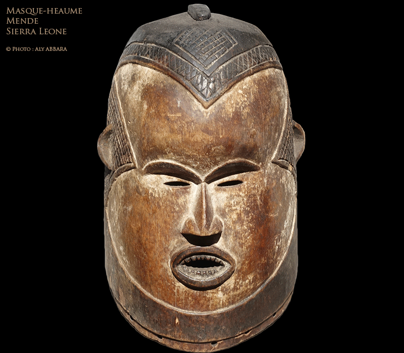 - Chez le peuple Mende, la confrérie féminine "Sandé ou bundu" utilise des masques-heaumes très raffinés lors des fêtes solennelles ; de l'exercice de la justice ; des funérailles des grands personnages ; des réceptions officielles et enfin, lors des rites d'initiation où les femmes de la haute dignité de la confrérie portent ces masques au moment où elles accueillent les jeunes filles initiées après leur retraite dans la forêt durant trois mois (dans une école de brousse où les filles approfondissent leurs connaissances sur la vie avant et après le mariage, au stade d'épouse puis mère et grand mère).