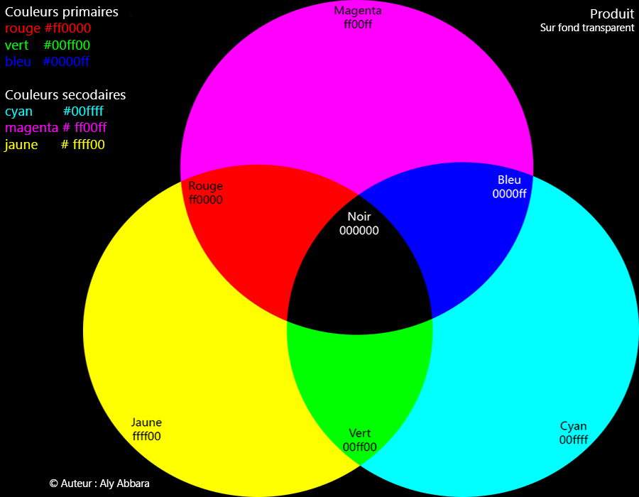 Les explications se retrouvent dans le code hexadécimal de chaque couleur avec la synthèse par produit de ces codes :
