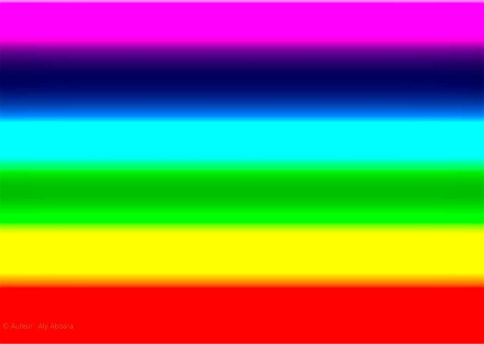 | Sectorisation des couleurs visibles permettant l'obtention les trois couleurs primaines (système RVB : rouge (#ff0000) ; vert (#00ff00) et bleu (#0000ff) et les trois couleurs secondaires (système CMJ : cyan (#00ffff) ; magenta (#ff00ff) et jaune (#ffff00) Consulter : code hexadécimal |