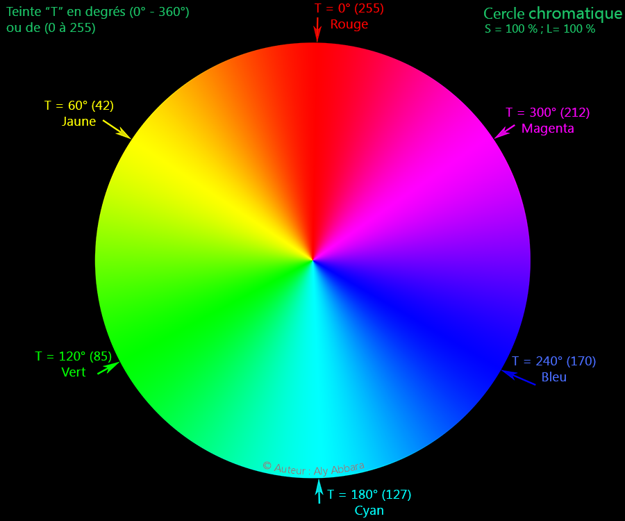 On peut remarquer que le rouge se trouve à la position 0° (ou 360°) ou (0 ou 255) ; le jaune à la position 60° (42/256) ; le vert à la position 120° (85/256) ; le cyan à la position 180° (127/256) ; le bleu à la position 240° (170/256) et enfin le magenta à la position 300° (212/256). Chaque couleur se situe à l'opposé de son complément : rouge-cyan (#ff0000-#00ffff) ;