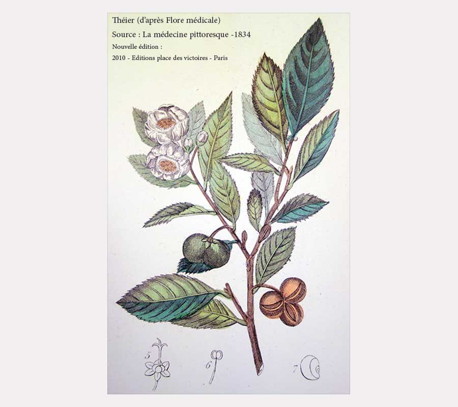 Le thé, si célèbre par le commerce immense que l'on fait de ses feuilles, que l'on transporte par toute la terre et qui fournissent par infusion une liqueur agréable, d'une saveur astringente et amère, est un arbrisseau toujours vert, qui croît naturellement en Chine, au Japon, en Cochinchine et en général dans tout l'orient de l'Asie. On le cultive dans plusieurs jardins de l'Europe : il vit très bien dans les serres chaudes mais y fructifie rarement. [...] Le thé de bonne qualité doit être récent, net, uniforme, sans poussière, pesant, bien sec, d'une couleur verdâtre, d'une saveur agréable quoiqu'amère et un peu styptique. mais sans âcreté ; d'une odeur aromatique très suave, sentant un peu la violette odeur qui ne lui est point particulière, puisqu'il paraît que les Chinois la lui communiquent en le maintenant plus ou moins longtemps en contact avec des végétaux odorants, parmi lesquels on a surtout reconnu les fleurs de l'Oléa fragrans. celles du Camellia sesanqua et du Magnolia iulan, L. [...] Comme toutes les substances commerciales qui nous sont envoyées de loin, le thé est sujet à être altéré. Les Chinois y ajoutent parfois des brindilles de bois, du sable ferrugineux pour en augmenter le poids ; d'autres fois ils l'altèrent avec des sortes avariées, défectueuses ; ou bien les marchands fraudeurs le mêlent avec des feuilles de plantes indigènes ou exotiques. [...]