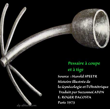 Il s'agit d'une coupe dans laquelle le col utérin doit être logé, puis cette coupe est fixée sur une tige d'une longueur suffisante pour que son extrémité distale puisse atteindre la région vulvaire, cette extrémité, il fallait l'attacher par des ficelles élastiques à une ceinture afin que la coupe et la tige restent fixés dans le vagin.