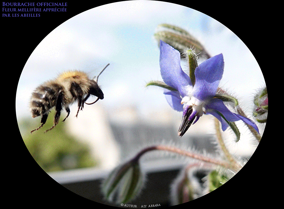 Les poches qui se trouvent autour des appendices des étamines (entre les bases des étamines et leurs appendices, et entre les appendices et les écailles) sont des réservoirs à nectar (zones nectarifères ou nectaires) très apprécié par les abeilles et les insectes et papillons, ce qui fait de la fleur de la bourrache, par excellence, une fleur mellifère (qui produit un abondant nectar utilisé par les abeilles pour fabriquer le miel). L'appréciation manifeste du nectar de la bourrache officinale par les abeilles est à l'origine de son surnom : " Pain des abeilles ".