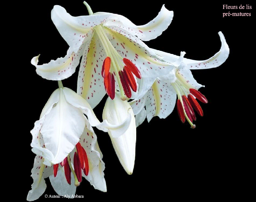 | Fleurs de Lis de la variété " Lilium auratum " ou " Lis impérial " au stade de pématurité avec des anthères recouvertes d'un fin film rendant la libération du pollen encore impossible أزهار من الزَنْبق الإمبرطوري في مرحلة ما قبل النضج حيث ما زال تحرير حب الطلع غير ممكن Le Japon : اليابان |