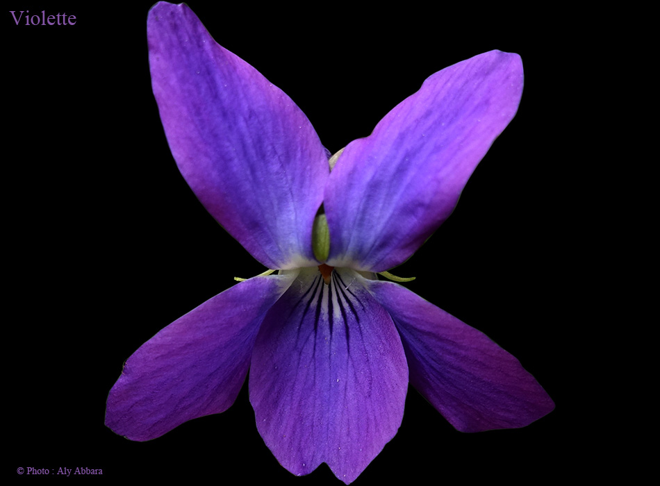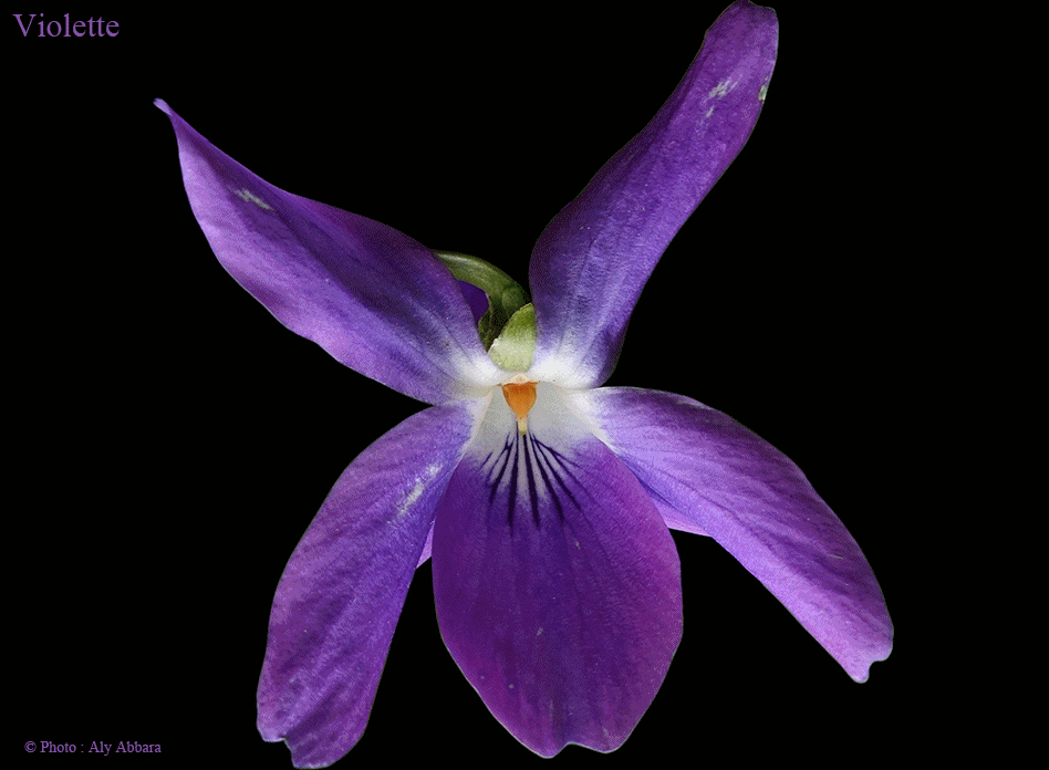 - Les fleurs " Violettes " sont solidaires, isolées à l'aisselle des feuilles ; inodores ; de 2 à 2,5 cm de diamètre, de couleur bleu violacé ; elles sont composées de cinq pétales inégaux et étroits disposés symétriquement par rapport à un plan vertical et par rapport au centre ; ils ne se recouvrant pas sur leurs bords ; le pétale inférieur se prolonge à l'arrière pour former un éperon creux et mince, violet un peu relevé à son bout.