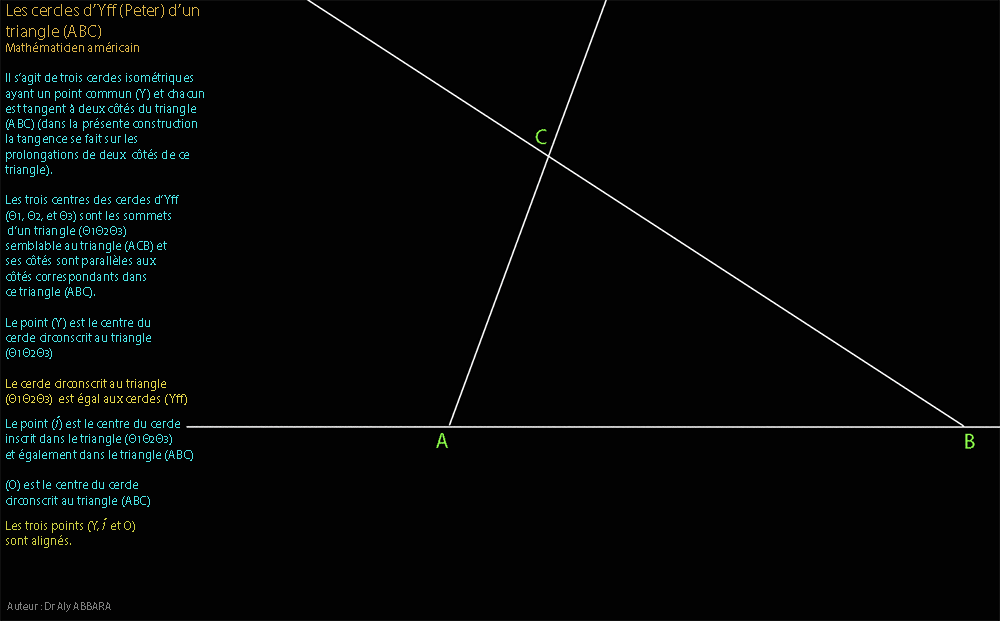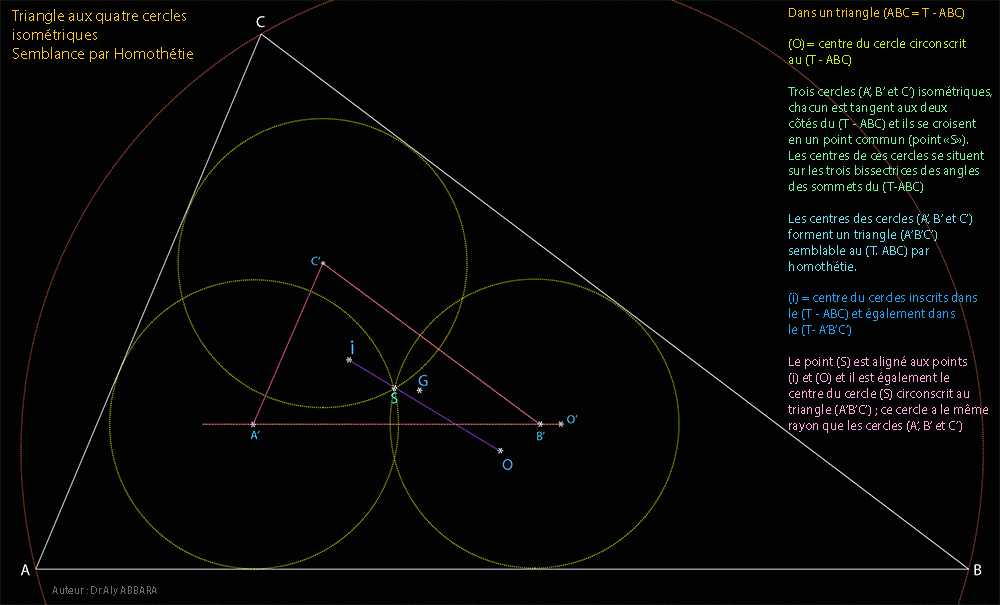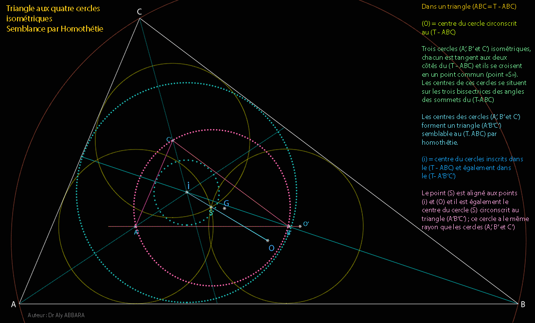 * Trois cercles (A’, B’ et C’) isométriques inscrits dans le triangle (ABC) et chacun est tangent aux deux côtés du (T - ABC) ; ils se croisent en un point commun (point «S» ou «Y»).