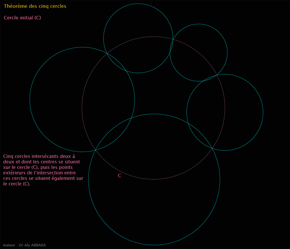 Cinq cercles complémentaires intersécants deux à deux et dont les centres se situent sur le cercle (C), puis les points extérieurs de l’intersection entre