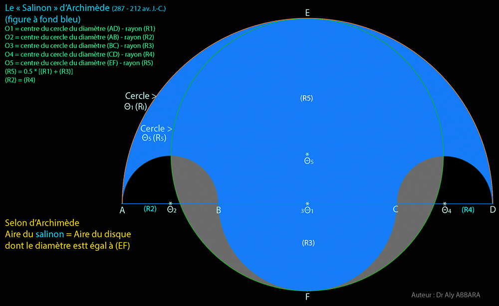 (S1) = (S2) ⇒ aire du Salinon d'Archimède = aire du disque (Θ5) = {0.25 *π * [(R1) + (R3)]²}.