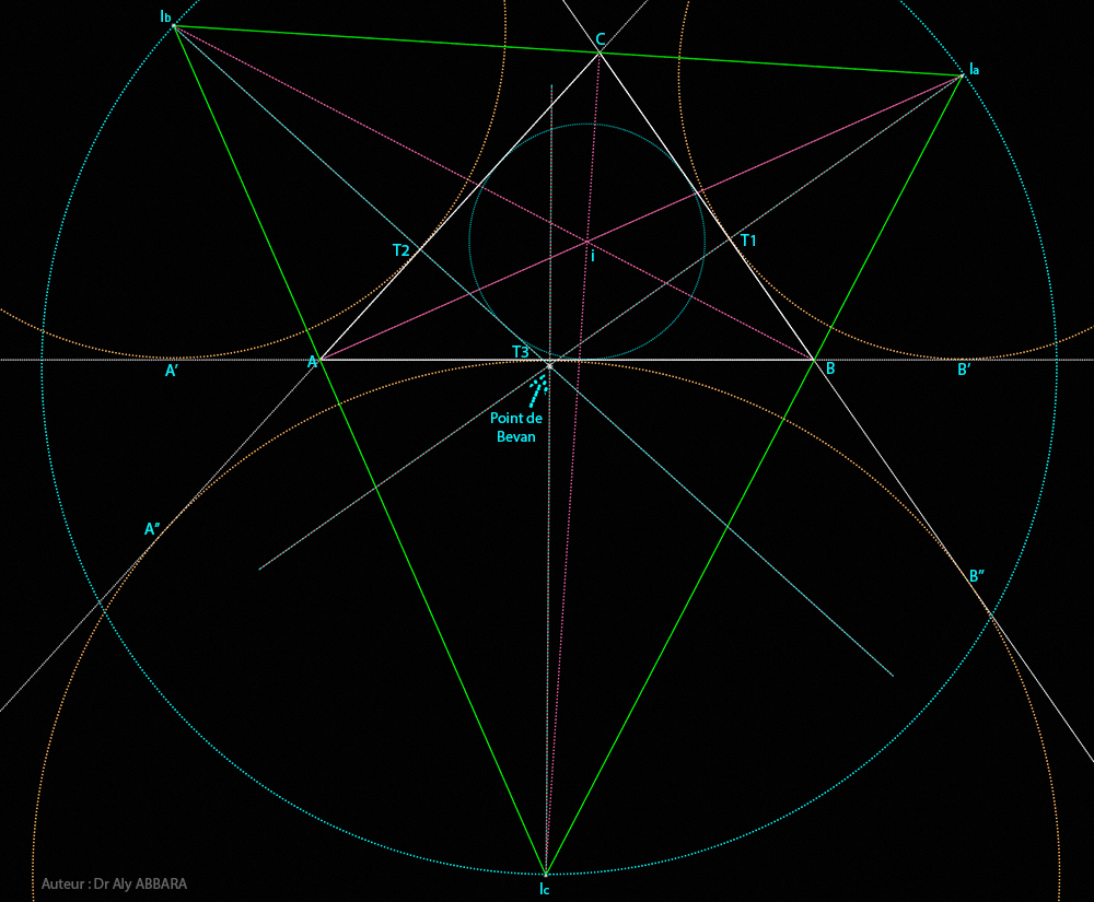 Les trois droites [(Ia-T1) ; (Ib-T2) ; (Ic-T3)] se croisent en un seul point appelé "Point de Bevan".