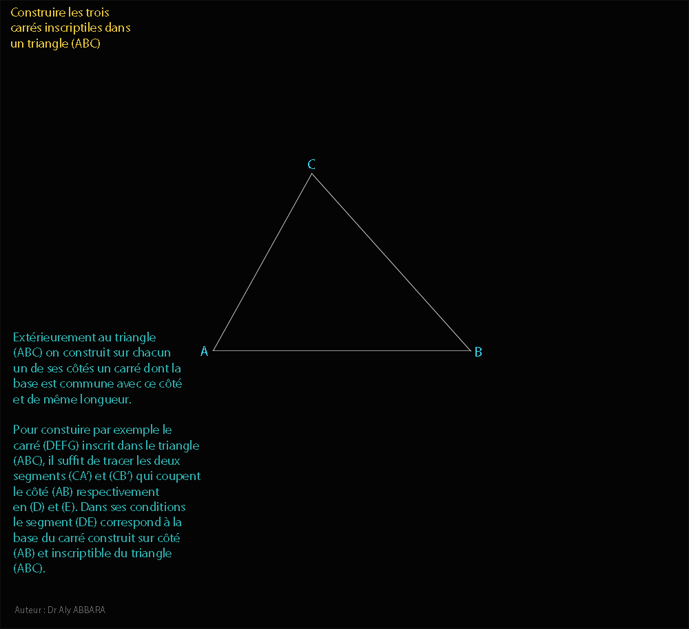 Pour construire par exemple le carré (DEFG) inscrit dans le triangle (ABC) sur son côté (AB), il suffit de tracer les deux segments (CA’) et (CB’) qui coupent le côté (AB) respectivement en (D) et (E).
