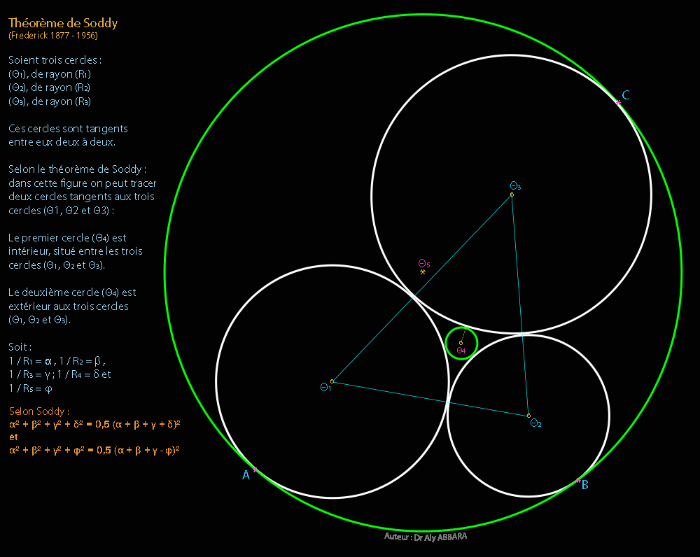 * - Dans cette figure on peut tracer deux cercles chcun est tangent aux trois cercles initiaux (Θ1, Θ2 et Θ3) :