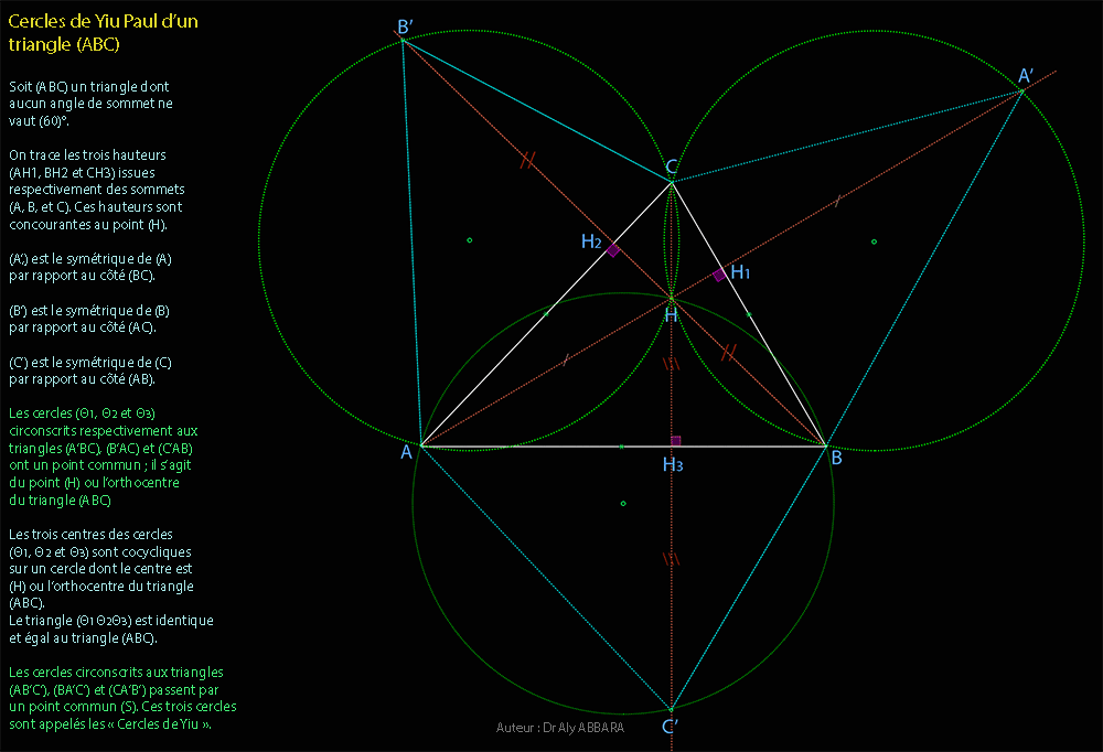 * - Les cercles (Θ1, Θ2 et Θ3) circonscrits respectivement aux triangles (A’BC), (B’AC) et (C’AB ont un point commun ; il s’agit du point (H) ou l’orthocentre du triangle (ABC)
