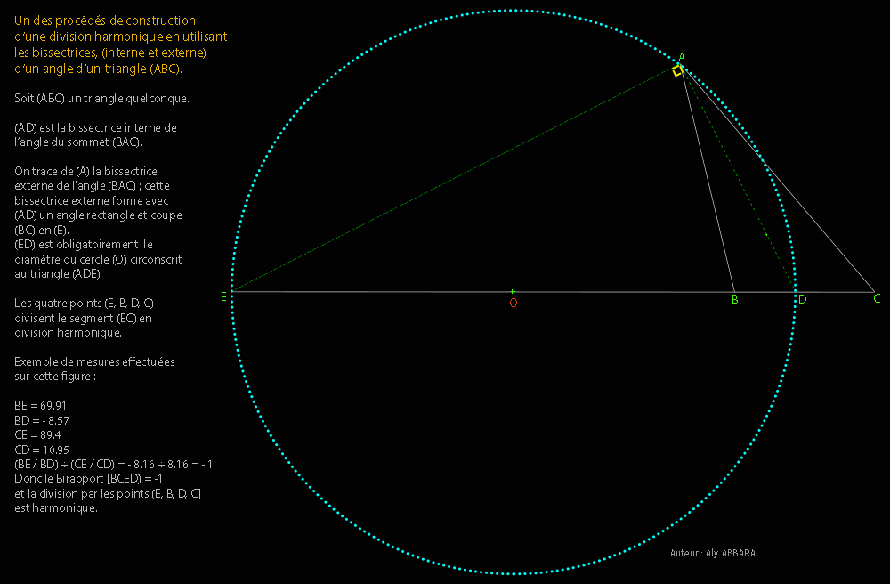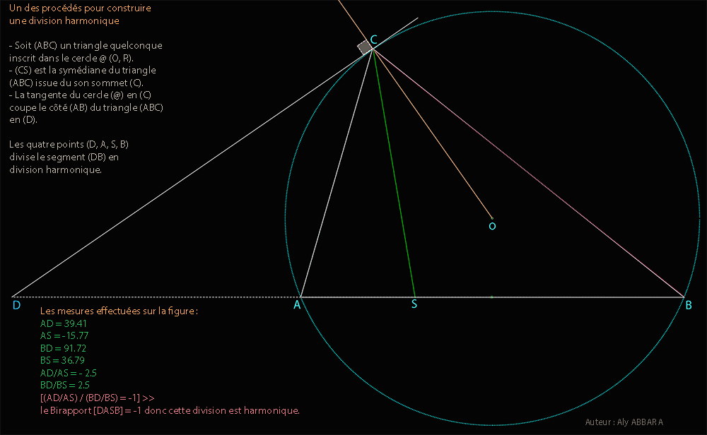 La figure ci-dessus montre un des procédés de construction d'une division harmonique en utilisant une symédiane d'un triangle (ABC) et d'une tangente au cercle circonscrit à ce triangle :