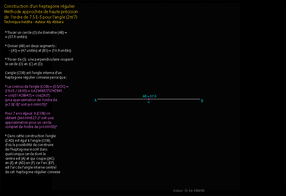 * Dans l'heptagone irrégulier (ADGBCFE) on peut calculer les longueurs de ses différents segments en prenant comme une base de calculs la constante prédominante que j'ai trouvé dans les heptagones réguliers, il s'agit de la constante que je symbolise par (⊙).
