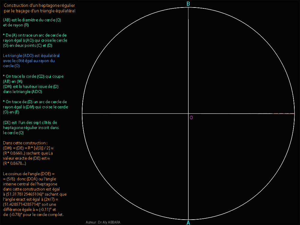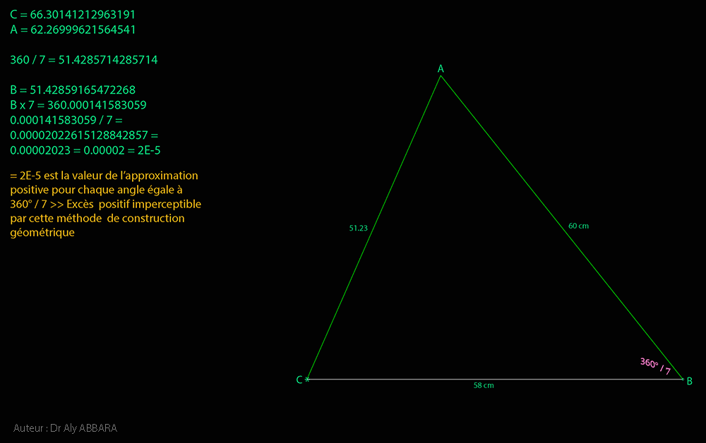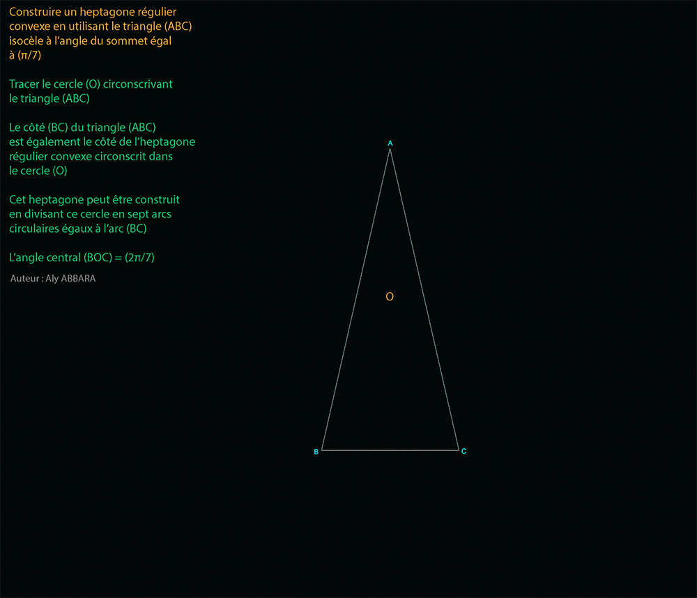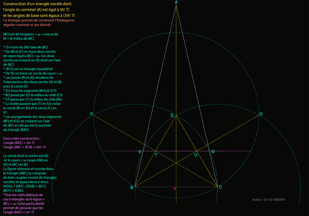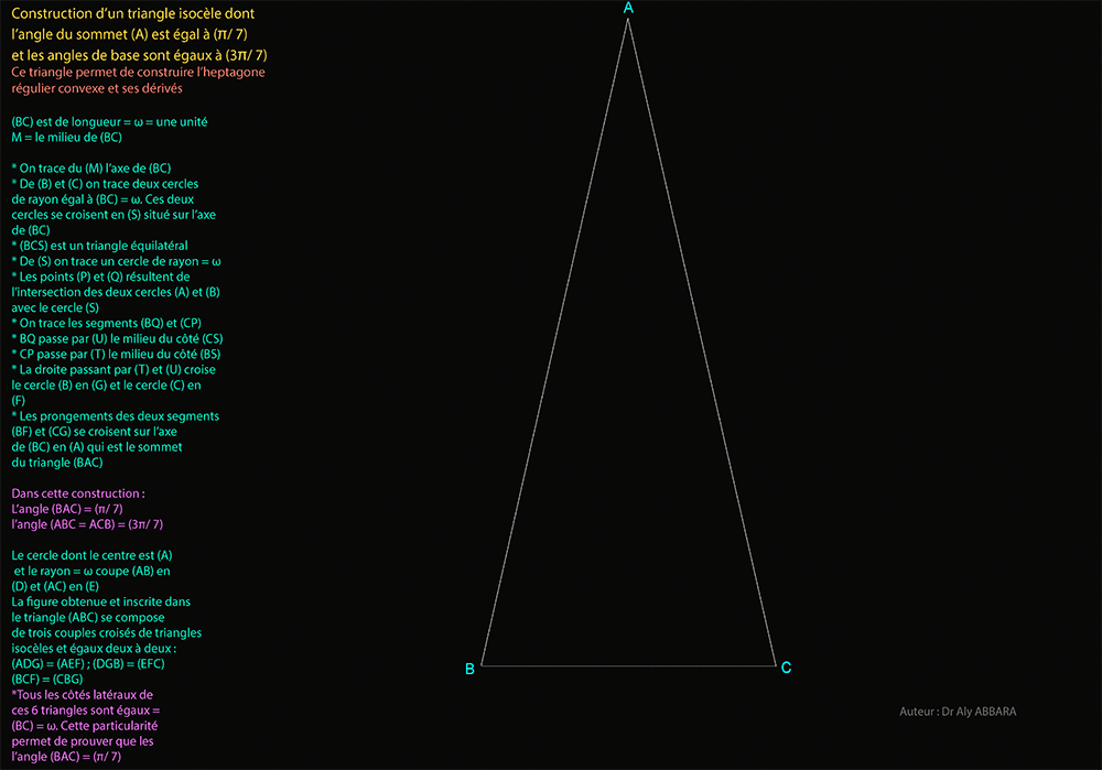 º - Le triangle isocèle (BAC) résultant de cette construction se caractérise par le fait que son angle du sommet (BAC) = (π/ 7) et ses deux angles de la base (ABC et ACB) valent (3π/ 7).