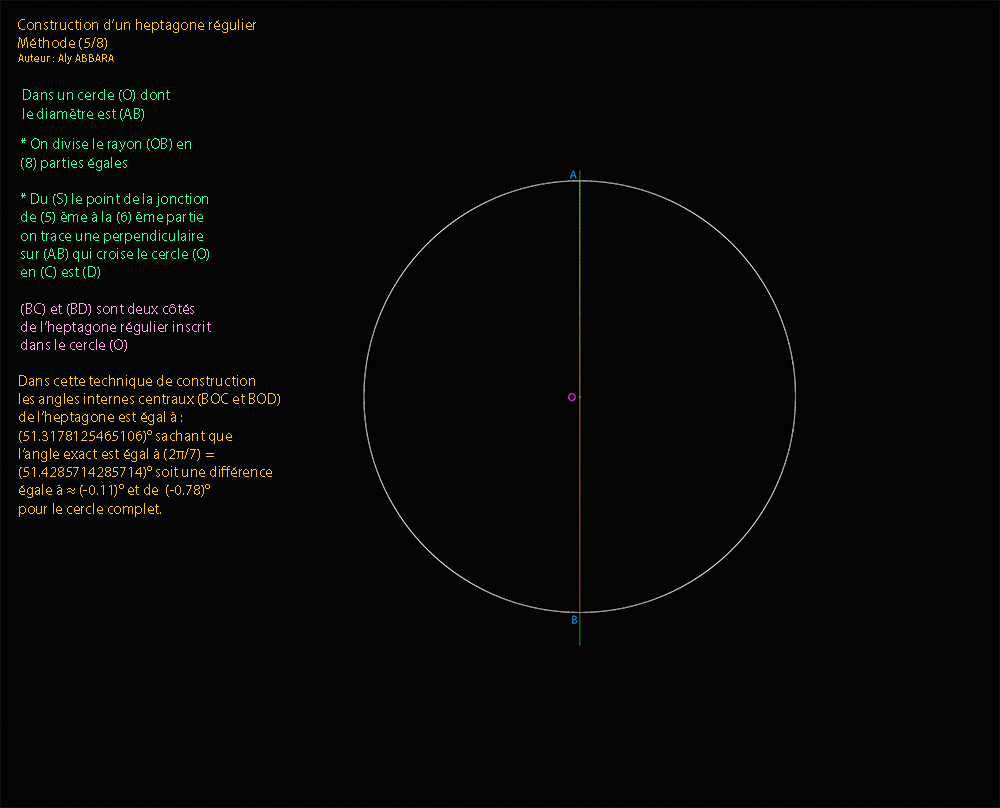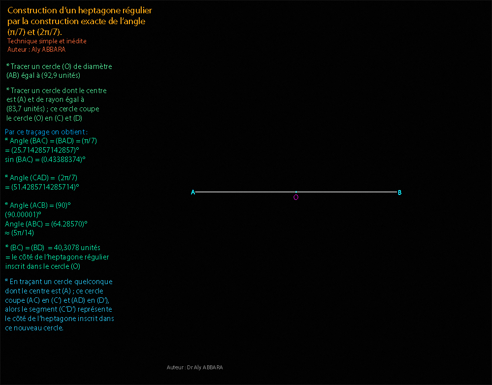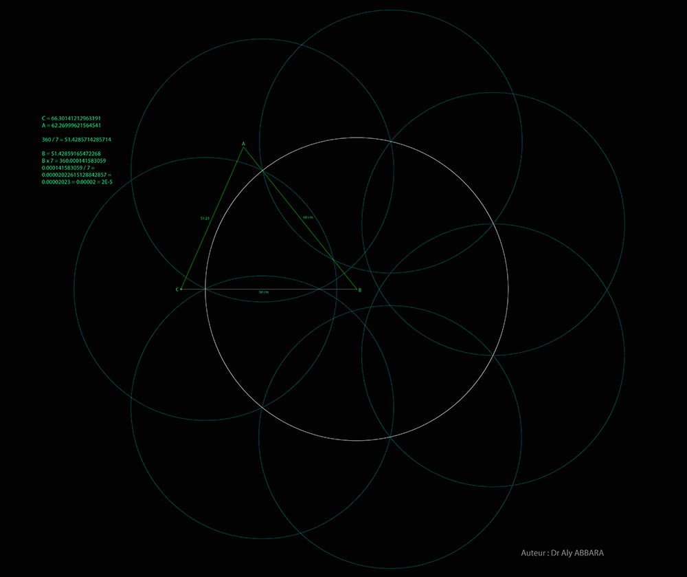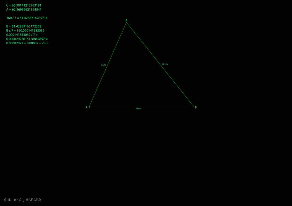 º - Le triangle isocèle (BAC) résultant de cette construction se caractérise par le fait que son angle du sommet (BAC) = (π/ 7) et ses deux angles de la base (ABC et ACB) valent (3π/ 7).