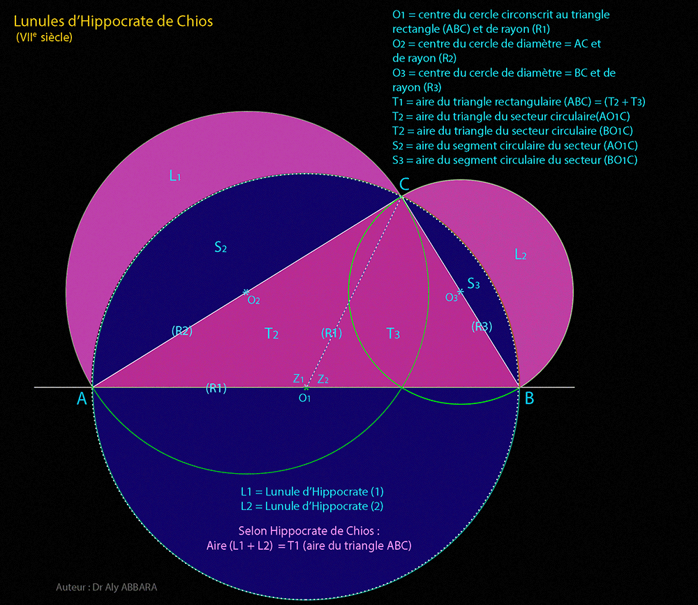 L1 = la lunule d'Hippocrate située à l'extérieur du segment circulaire (AC = S2) du cercle (O1) et limité par l'arc circulaire extérieur du cercle (O2).