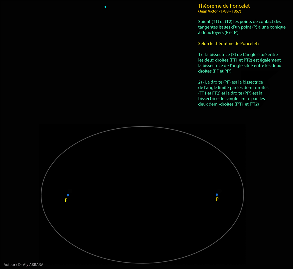 Soient (T1) et (T2) les points de contact des tangentes issues d’un point (P) à une conique à deux foyers (F et F’).