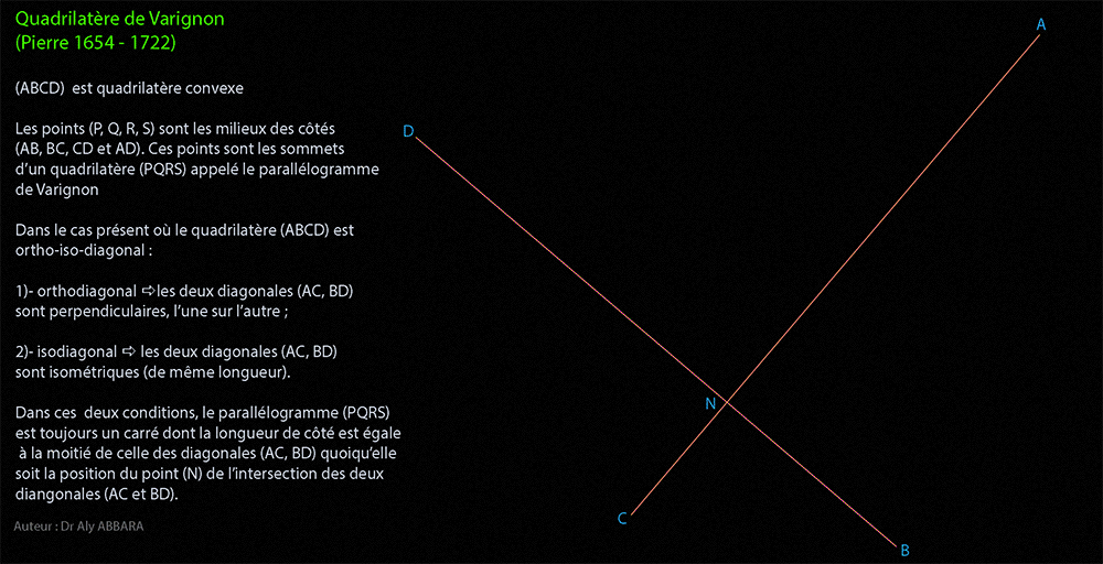 Dans ces deux conditions, le parallélogramme (PQRS) est toujours un carré dont la longueur de côté est égale à la moitié de celle des diagonales (AC, BD) quoiqu’elle soit la position du point (N) de l’intersection des deux diangonales (AC et BD).